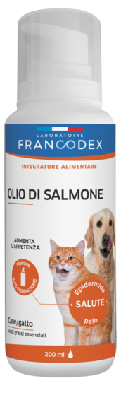 Gli acidi grassi essenziali (omega-3 e omega-6) contenuti nell’OLIO DI SALMONE FRANCODEX sono indispensabili per offrire il giusto supporto a numerose funzioni dell’organismo. Una loro carenza può provocare, tra gli altri effetti indesiderati, opacità del manto, forfora e perdita di pelo.