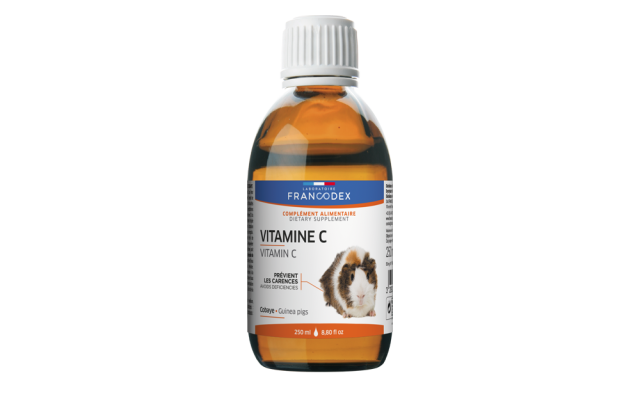 Spécificité du cochon d’Inde : il ne synthétise pas la vitamine C. Celle-ci doit donc être apportée en quantité suffisante chaque jour dans l’eau de boisson ou l’alimentation. Une carence peut se traduire par des difficultés à se déplacer, voire un arrière-train paralysé, des problèmes de dentition, de pelage… La dose quotidienne recommandée en vitamine C pour un cochon d’inde est de 20 mg par kilo.