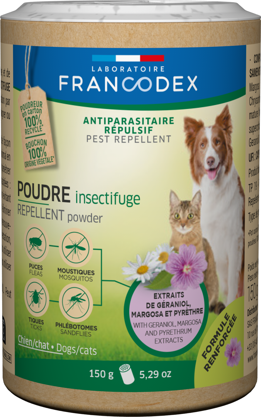 La Poudre Insectifuge protège votre animal de toute infestation par des parasites grâce au margosa, pyrèthre et géraniol*