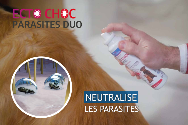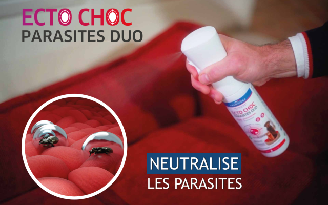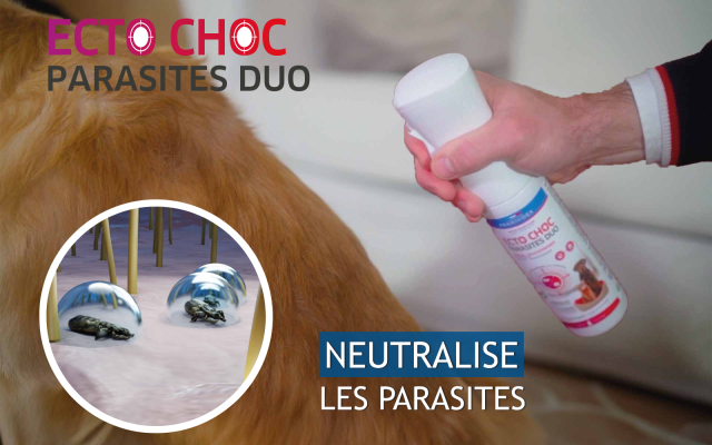 Découvrez notre nouvelle gamme de produits ECTO CHOC, qui agit sur les parasites présents sur l'animal et dans son habitat.