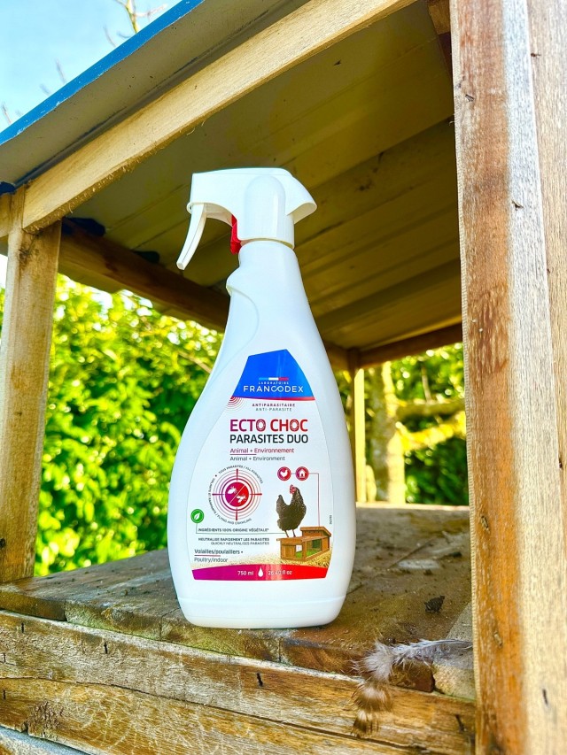 Le spray Ecto Choc Parasites DUO pour la basse-cour en format 750ml est fabriqué en France. Il neutralise les parasites volants et rampants : poux rouge, puces, tiques, moustiques, phlébotomes et mouches !