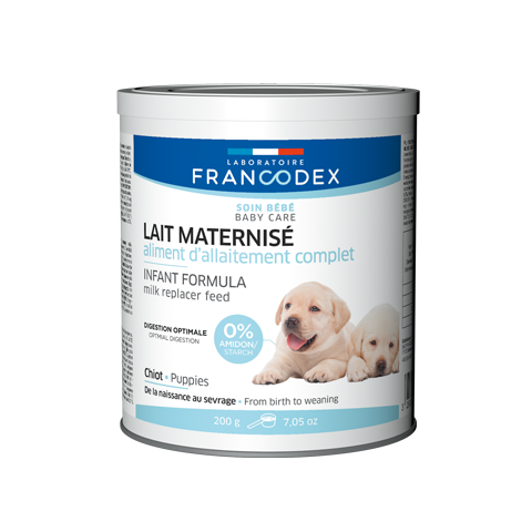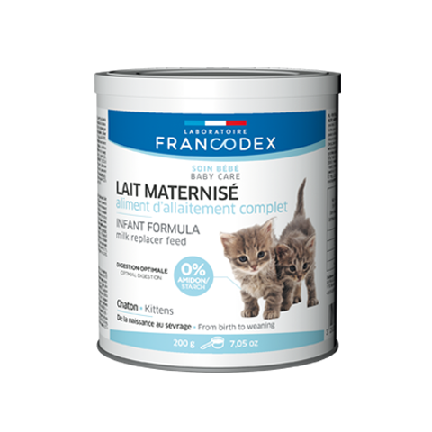 Le Lait Maternisé Francodex permet l'alimentation des chatons et chiots orphelins, ou la complémentation de l'alimentation lactée maternelle. L'apport équilibré en protéines, matières grasses, vitamines, minéraux et oligoéléments soutient la croissance du chaton et du chiot. Le Lait Maternisé apporte également des fructo-oligosaccharides pour soutenir la flore intestinale, et ne contient pas d'amidon, pour une meilleure digestion.