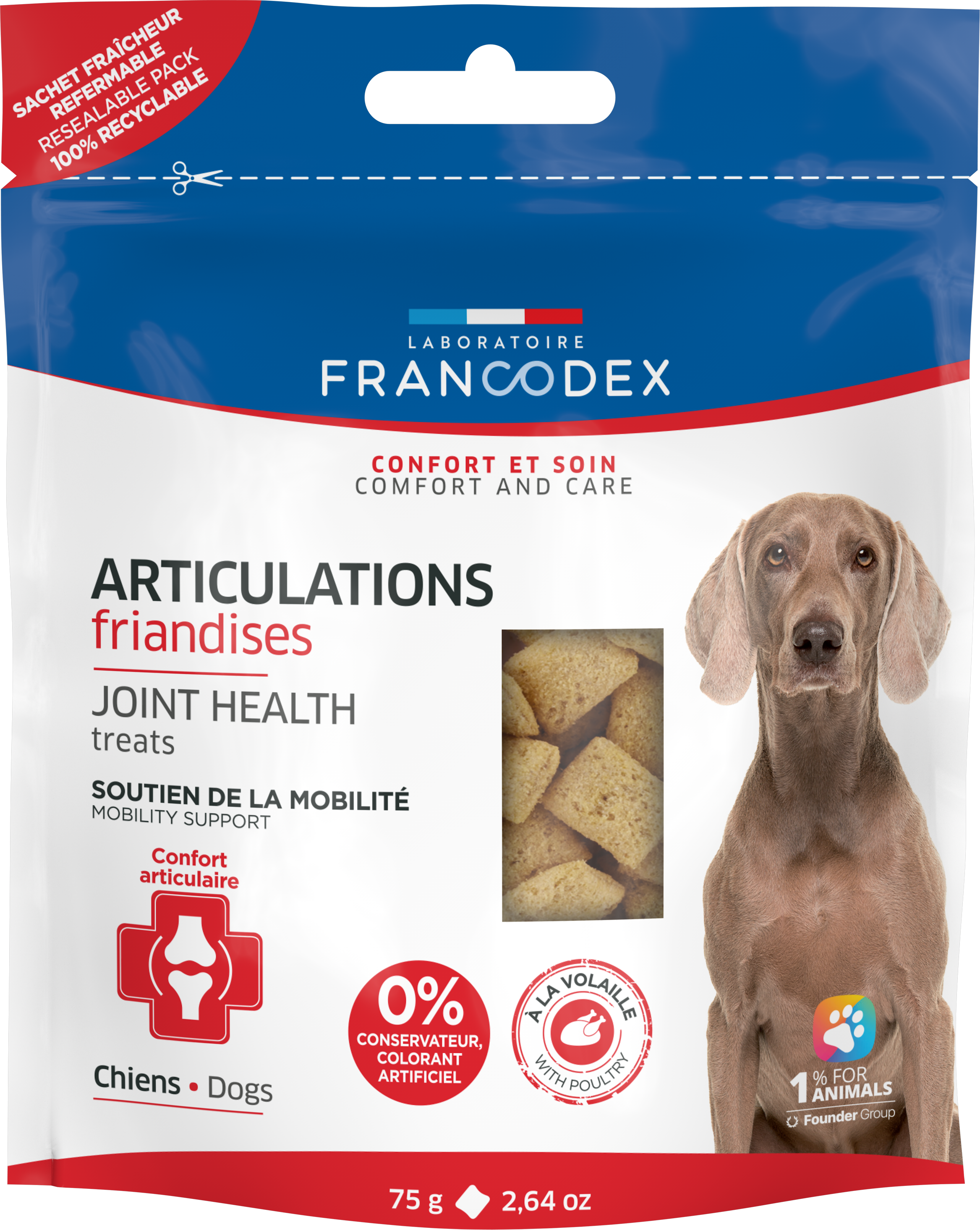 Nos Friandises Articulations contiennent un mélange de nutriments du cartilage (glucosamine, chondroïtine) qui participent à la mobilité et au confort articulaire des chiens. Sans colorant ni conservateur artificiel, elles contiennent également des acides gras omega 3 et omega 6 et des vitamines A, D3 et E.